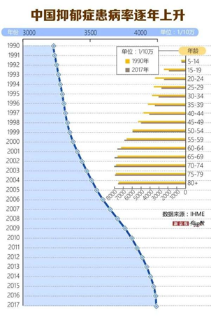 中国疾控中心周脉耕等人通过分析全球疾病负担2017年数据发现,中国的抑郁症已从1990年的全因残疾调整生命年(DALYs,从发病到死亡所损失的全部健康寿命年)的第15位上升到2017年的第10位。