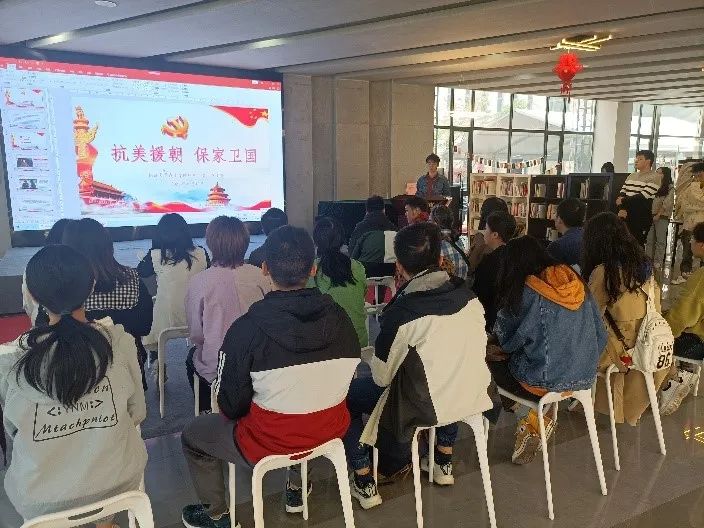研究生第五党支部的吕宇航同学从抗美援朝战争的战前背景开始讲起,详细介绍了抗美援朝战争中的主要历史事件、从中涌现出的英雄人物以及抗美援朝胜利的历史意义,并带领我们学习了这段历史中体现出的可贵的爱国主义精神。
