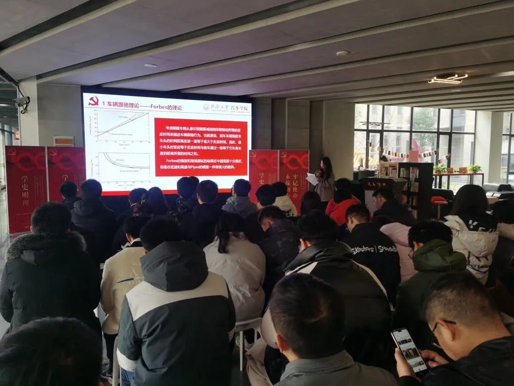 本科生第二党支部的陈智雯同学和邓世越同学以“车辆跟驰模型新发展”为主题,从经典的跟驰模型引入,介绍了在车路协同背景下的跟驰模型新发展。陈智雯同学首先介绍了三种车辆跟驰理论以及四种经典跟驰模型。以迈腾ACC自适应巡航系统的展示视频为引子,讲解了车辆跟驰模型在汽车领域的应用。