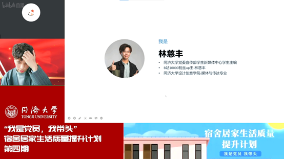 3月25日下午3点,“我是党员 我带头”宿舍居家生活质量提升计划最后一期直播顺利开展。本次直播我们邀请到了同济大学新媒体官方运营成员,曾受邀在优秀大学生事迹宣讲中展示的林慈丰同学为我们分享他对新媒体行业的感悟。