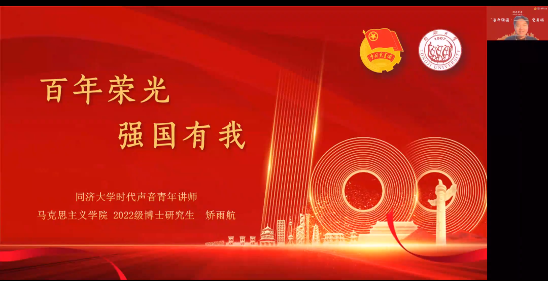 本次决赛展演也邀请到了同济大学时代声音传播社的学生代表矫雨航同学以”百年荣光 强国有我“为题进行分享。分享中,她从百年前青年团成立时青年人的热情和同济青年的光荣传统两个方面讲述了千千万万青年在团的培养下坚定信仰、跟党走,投身于革命滚滚浪潮的感人故事。同时,她也号召全体同济青年学子把忠诚书写在党和人民的事业中,把青春播撒在民族复兴的征程上,把光荣镌刻在历史前进的史册里,继续“与祖国同行,与科教济世”,接续同济人的光荣传统。