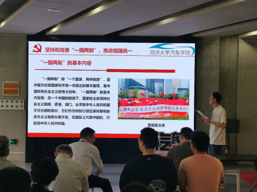 研究生第十八党支部郑联庆同志带来题目为“坚持和完善一国两制,推进祖国统一”的理论分享。他详细介绍了一国两制的内涵,并就一国两制的精髓要义和重大意义进行了详细阐释。“和平统一、一国两制”方针是实现两岸统一的最佳方式,对两岸同胞和中华民族最有利。要坚持一个中国原则和“九二共识”,在此基础上,推进同台湾各党派、各界别、各阶层人士就两岸关系和国家统一开展广泛深入协商,共同推动两岸关系和平发展、推进祖国和平统一进程。坚持团结广大台湾同胞,坚定支持岛内爱国统一力量,共同把握历史大势,坚守民族大义,坚定反“独”促统。国家统一、民族复兴的历史车轮滚滚向前,祖国完全统一一定要实现,也一定能够实现!