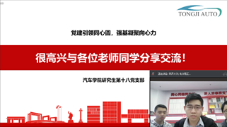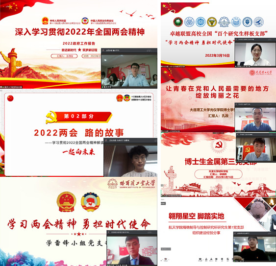 为深入学习贯彻全国两会精神,提高党员的政治素质和理论修养,增强党支部的创造力、凝聚力和战斗力,2022年3月16日下午,卓越联盟高校8个全国“百个研究生样板党支部”联合开展了“学习两会精神 勇担时代使命”云端共建活动。本次学习共有来自同济大学、北京理工大学、大连理工大学、重庆大学、东南大学、哈尔滨工业大学、天津大学、西北工业大学共8个样板党支部参与。