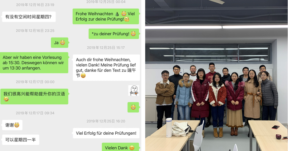 “知行合一,学以致用”,他还努力将学到的知识运用于生活实践中,服务师生,积极促进对外交流。在研一与研二期间,他担任了德语学习班班长、中德合授专业课助教,负责与外教老师沟通与协调上课时间,并组织班级成员与德国留学生进行口语训练,提升双方语言能力,获得了中德师生的一致好评。