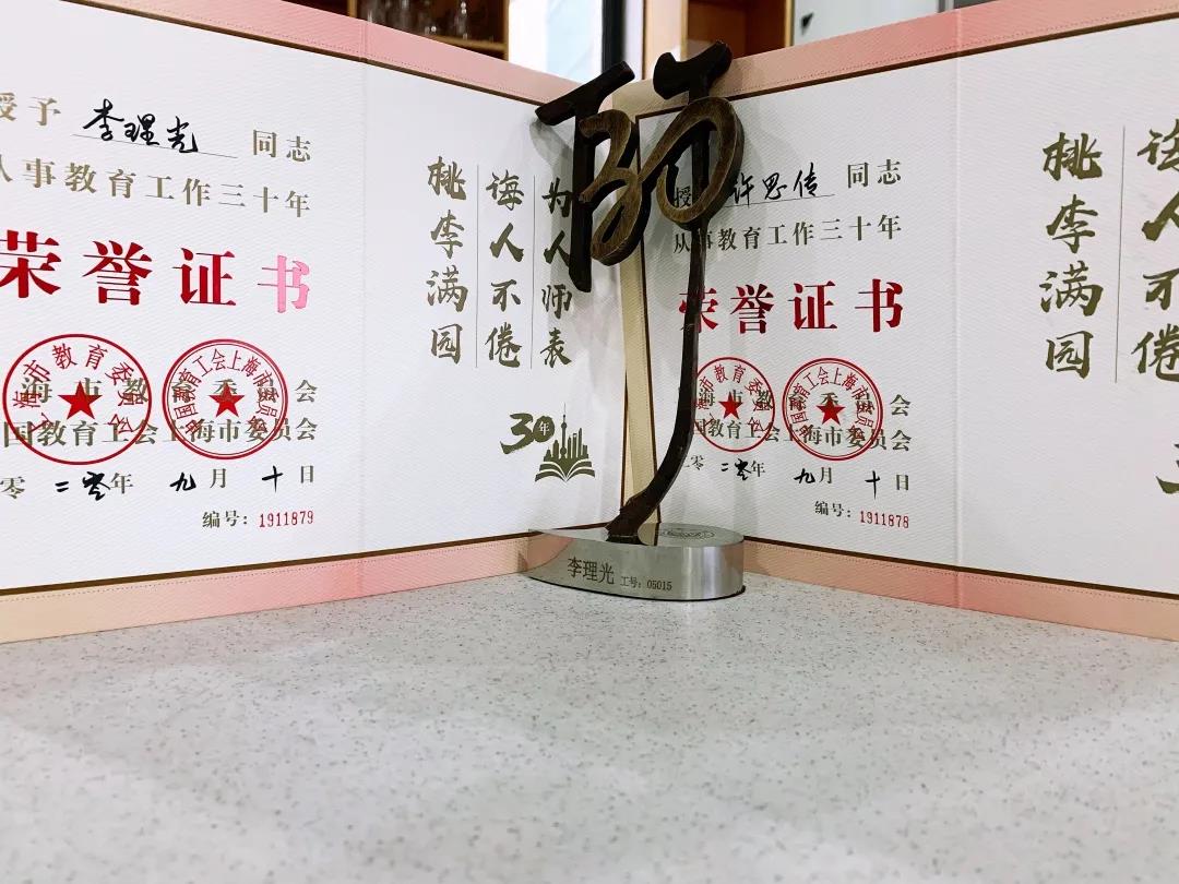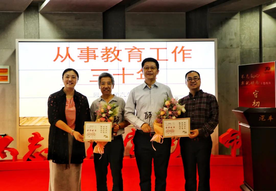 从教三十年的李理光、许思传两位老师颁发纪念证书,以此表彰他们在教育事业上的突出贡献。