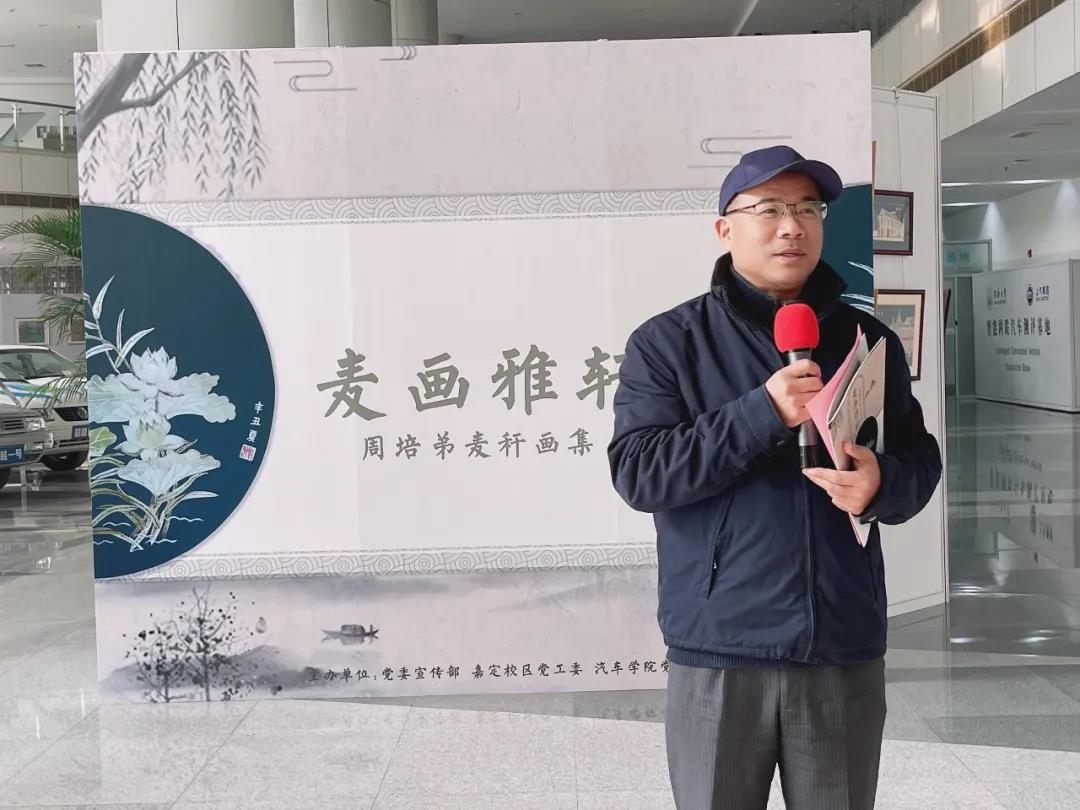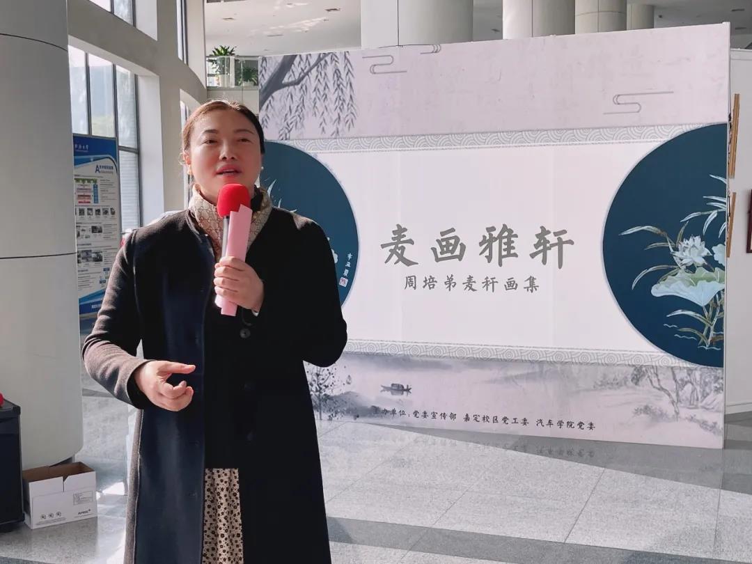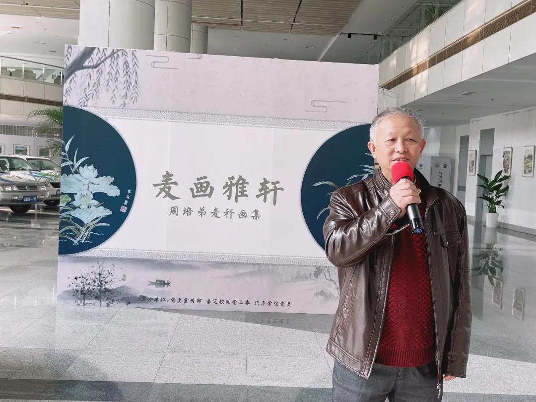 2021年12月7日中午,即时足球比分 退休教师周培弟“麦画雅轩”个人麦秸秆画作品展于嘉定校区新能源汽车工程中心一楼大厅成功举行。此次活动得到校党委宣传部、嘉定校区党工委、即时足球比分 党委、工会的大力支持。嘉定校区党工委副书记覃文忠、即时足球比分 党委书记曹静、院党委副书记兼工会主席邓俊、副院长吴旭东以及即时足球比分 40余名师生代表出席活动。