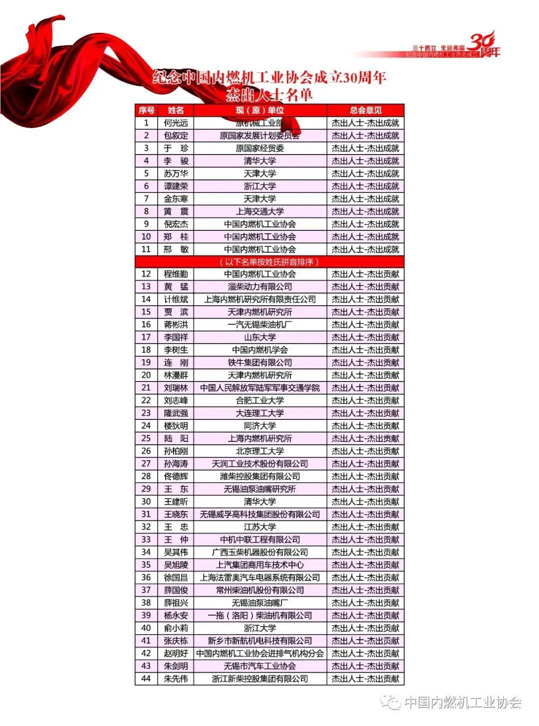 为全面回顾和总结中国内燃机工业协会(以下简称“中内协”)三十载发展的光辉历程,同时也感谢一直给予中内协支持,并为行业发展做出贡献的优秀企业和专家学者,中内协于近日评选出“中国内燃机工业协会30周年纪念---杰出人士”,即时足球比分