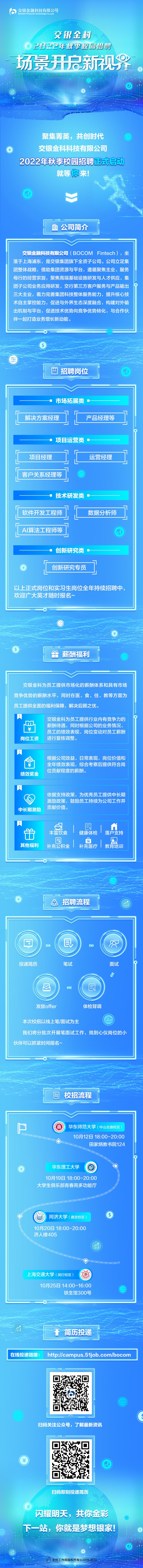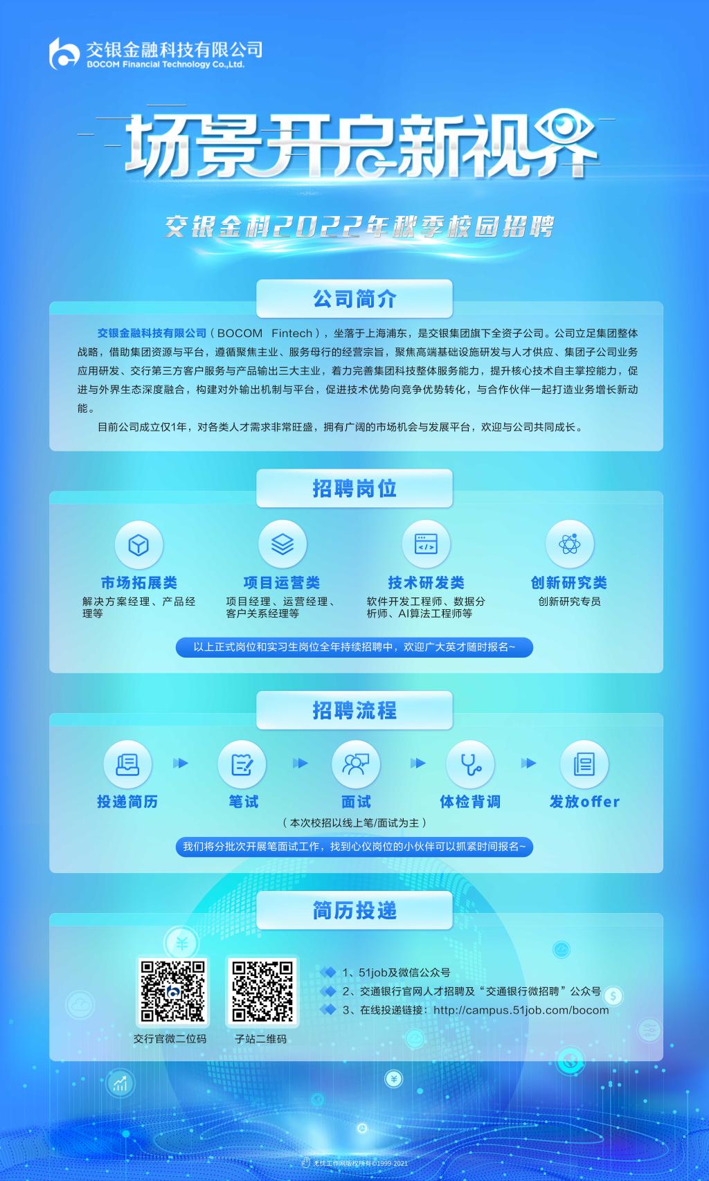 交银金科是交通银行集团旗下全新金融科子公司,坐标上海陆家嘴和临港新片区,今年正式运营以来,面向国内外高校开展人才招聘。公司处于快速成长期,成长空间大,发展机会多,致力于培养“金融+科技”复合型人才,对各类专业人才均敞开大门。招聘流程简便响应快速,应届生薪酬福利非常具有竞争力,在落户、购房等方面也有政策扶持。